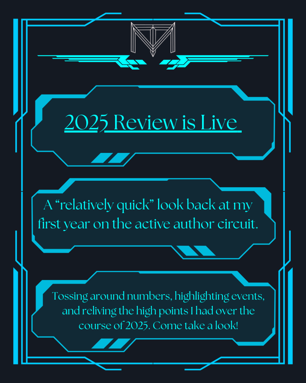 I am quite late in getting this out, but I can say that 2025 was a rousingly fun year for me as an author. Fair waring; this first section is a narrative review of what happened. I’ll have numbers at the bottom if that’s all you’re interested in, skip on down there now.